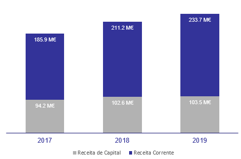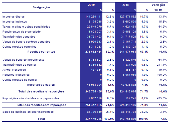 A receita total regista um acréscimo de 23,4 milhões de euros, relativamente ao ano de 2018. Para este acréscimo contribuem o aumento das receitas correntes de 22,5 milhões de euros, as receitas de capital com um aumento de 1,4 milhões de euros, as reposições não abatidas aos pagamentos com uma variação positiva de 2,2 milhões de euros, e a redução do saldo da gerência anterior em 2,7 milhões de euros.