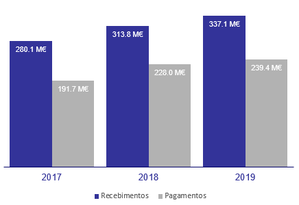 A comparação dos recebimentos e pagamentos no último triénio permite-nos verificar a tendência crescente quer dos recebimentos quer dos pagamentos. O crescimento mais acentuado dos recebimentos comparativamente com os pagamentos, ao longo do triénio, tem originado saldos de tesouraria expressivos que são integrados nas receitas do ano seguinte. Estes saldos associados fundamentalmente ao aumento das receitas fiscais, tem permitido a variação positiva ocorrida nos recebimentos. Para os pagamentos concorreram, em 2019, para além do investimento executado, a amortização antecipada da totalidade dos empréstimos de médio e longo prazo.