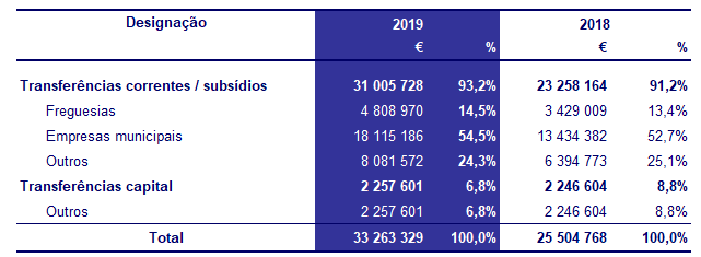 Para o aumento das transferências correntes concorrem, entre outros, os apoios às Freguesias e os apoios a instituições sem fins lucrativos, nomeadamente no âmbito das ações de interesse cultural, ações sociais e outras.