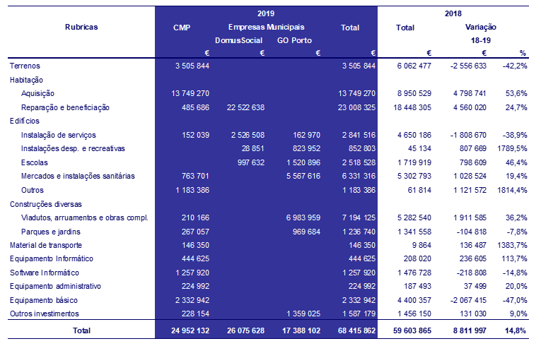 Em termos do investimento global, o valor executado atingiu o montante de 68,4 milhões de euros, que representa um acréscimo de 8,8 milhões de euros face a 2018, e resulta de um maior investimento das empresas municipais quer da Domus Social, EM, como da GO Porto, EM.