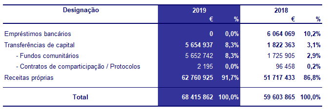 A principal fonte de financiamento do investimento autárquico é a receita própria (91,7%) resultante da poupança corrente. Considerando os excedentes de tesouraria, em 2019 não se procedeu à utilização do empréstimo bancário contratualizado para financiamento do investimento do Município tendo-se optado pelo pagamento da generalidade dos investimentos com recurso a receitas próprias.