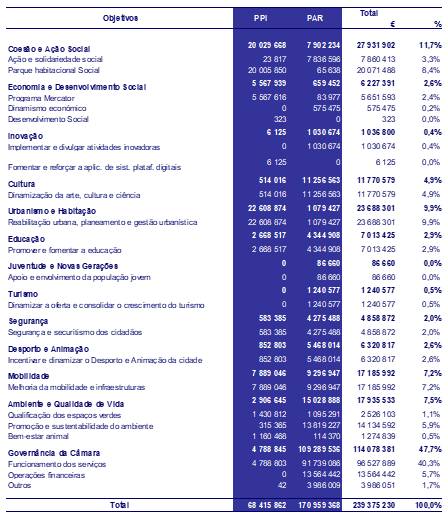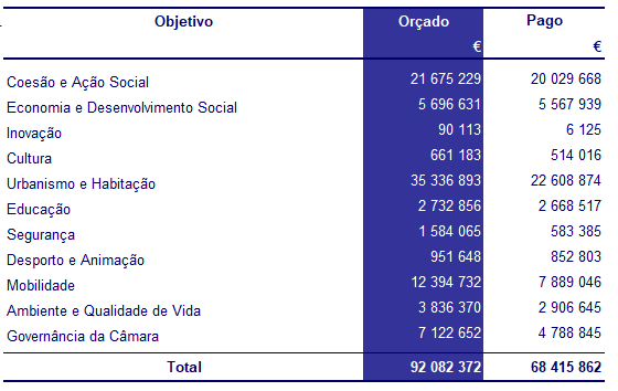 Tendo como referência os principais investimentos integrados na classificação por objetivos, verifica-se que o Urbanismo e Habitação, a Coesão e Ação Social, a Mobilidade e a Economia e Desenvolvimento Social no seu conjunto, absorveram 56,1 milhões de euros, o equivalente a 82% do investimento total.