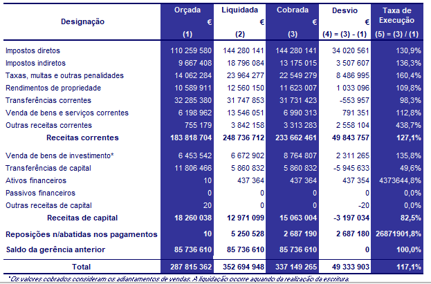 Em termos globais, as receitas correntes liquidadas ultrapassaram as previsões em 64,9 milhões de euros. Com exceção das transferências correntes, todos os restantes capítulos contribuíram para este crescimento, com especial destaque para os impostos diretos, os impostos indiretos, as taxas, multas e outras penalidades e para a venda de bens e serviços correntes, essencialmente em resultado da receita do IMT, derrama e IUC, do loteamento de obras, da ocupação da via pública, da publicidade, da taxa municipal turística, das coimas, multas e outras penalidades, das rendas e das refeições escolares, entre outras.