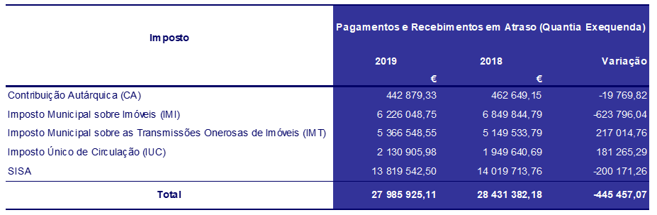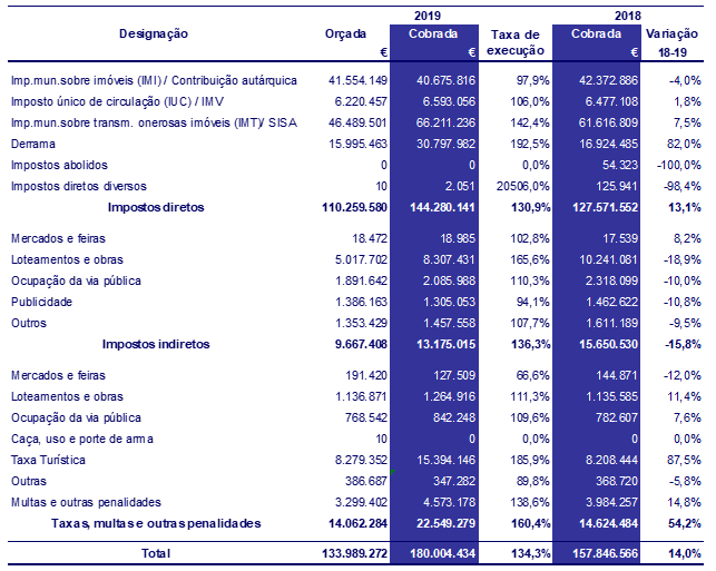Nos impostos indiretos, o valor cobrado em loteamentos e obras, particularmente nas infraestruturas urbanísticas e em ocupação da via pública contribuiu para que a taxa de execução fosse superior a 136%. Estas receitas continuam a revelar-se as receitas municipais próprias com maior expressão nos impostos indiretos, representando, no final do ano de 2019, 78,9% da receita total destes impostos.