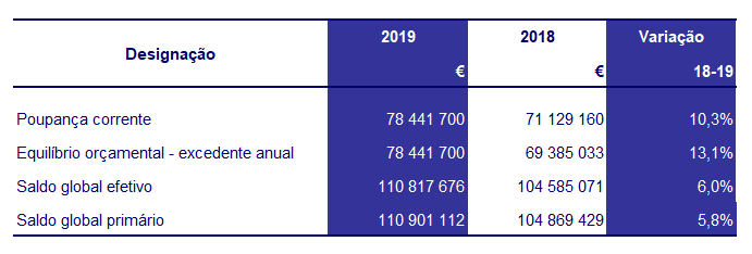 Em 2019, o saldo global efetivo foi de 110,8 milhões de euros. O desvio entre o saldo global efetivo orçamentado e o conseguido no final do ano resulta em grande parte do saldo de gerência do ano 2018, integrado no orçamento em sede de revisão orçamental e da cobrança de receita corrente face ao inicialmente previsto.