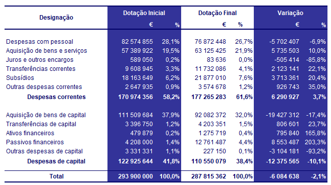 Embora a elaboração do orçamento seja norteada pela rigorosa identificação das despesas, durante a execução podem acontecer situações em que as dotações previsionais são excessivas, insuficientes ou até mesmo inexistentes, nomeadamente pelo tempo que decorre entre a preparação do orçamento e o início do ano económico a que respeita. Para ultrapassar estas situações, efetuaram-se modificações orçamentais que, no seu conjunto, determinaram uma diminuição do valor global do orçamento de 6,1 milhões de euros, entre as quais uma revisão para integração do saldo de gerência, transitado do ano anterior.