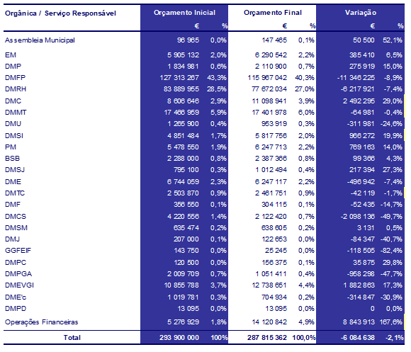 Quanto à despesa por Serviço Responsável verifica-se que, em 2019, a Direção Municipal de Finanças e Património (DMFP) é a direção que apresenta o maior peso em termos previsionais e em sede de execução de despesas, ao agregar as transferências para as empresas municipais, bem como algumas despesas de funcionamento transversais, de que se destacam os seguros e as indemnizações.