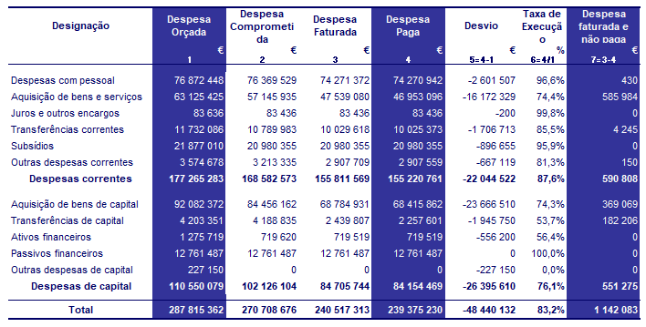 O valor global da despesa na ótica das Grandes Opções do Plano teve uma execução de 239,4 milhões de euros, dos quais 68,4 milhões de euros respeitam ao Plano Plurianual de Investimentos (PPI), e 171 milhões de euros ao Plano das Atividades mais Relevantes (PAR).