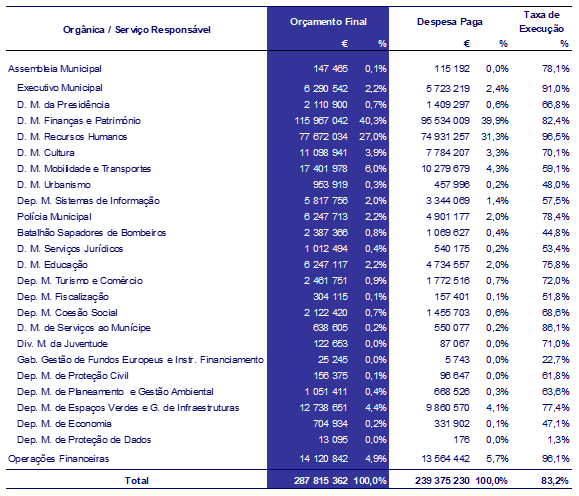 Por outro lado, todas as despesas com pessoal estão concentradas na Direção Municipal de Recursos Humanos (DMRH), sendo este serviço municipal o que apresenta o segundo maior peso no orçamento em sede de execução de despesas.