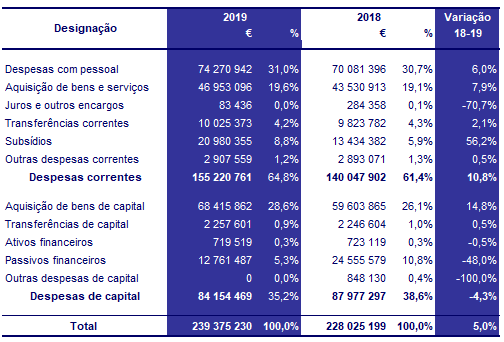 As despesas correntes orçamentadas para 2019 (177,3 milhões de euros) foram superiores às de 2018 (161,7 milhões de euros) em cerca de 9,6% e, em termos de execução, o aumento foi de 10,8%.
