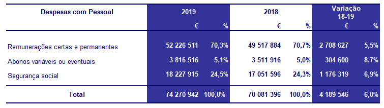 As despesas com pessoal apresentam, em 2019, uma variação positiva de 4,2 milhões de euros relativamente ao ano anterior.