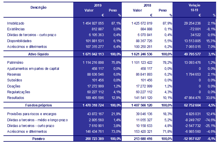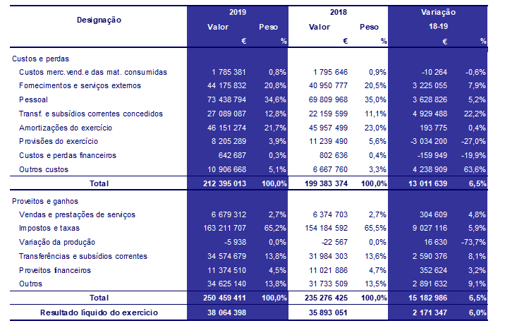 O orçamento de 2019 teve compromissos que representaram 94,1% do orçamento e uma faturação de 83,6%.