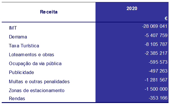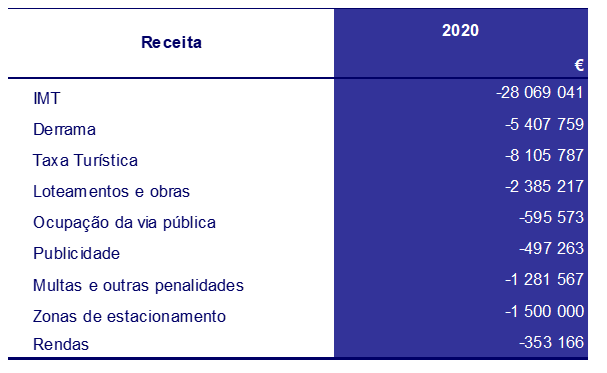 Entre as receitas fiscais destacam-se os impostos diretos, que se mantêm como principal receita do município, com um valor arrecadado superior ao orçado, em 34 milhões de euros. Concorrem para este aumento o IMT, a Derrama e o IUC, com desvios face ao valor previsto de 19,7 milhões de euros, 14,8 milhões de euros e 372,6 mil euros, respetivamente.